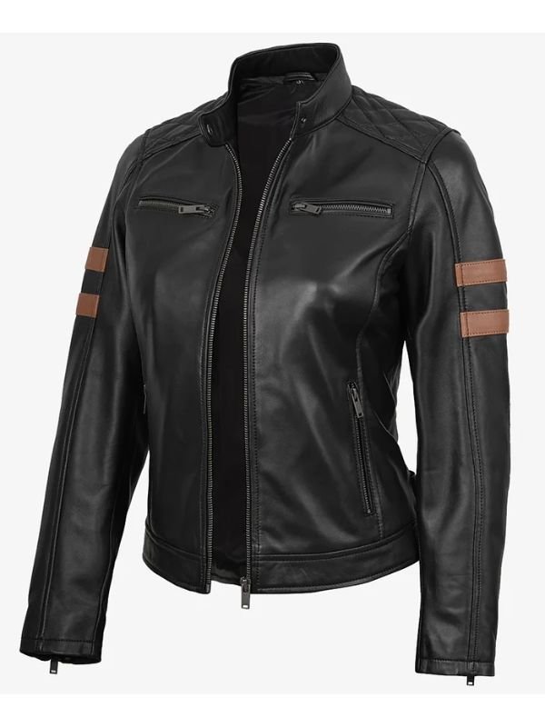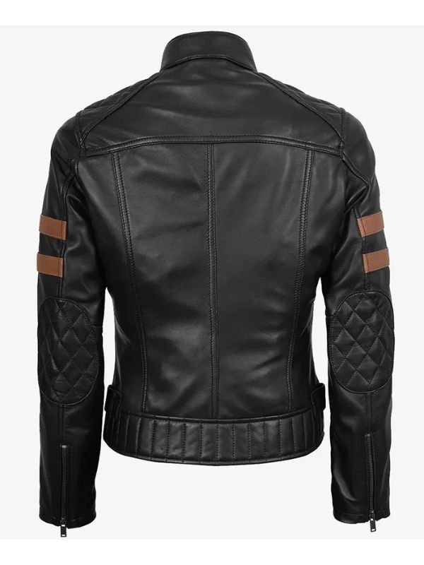 Women’s Black Fashion Biker Leather Jacket with Cognac Stripes
