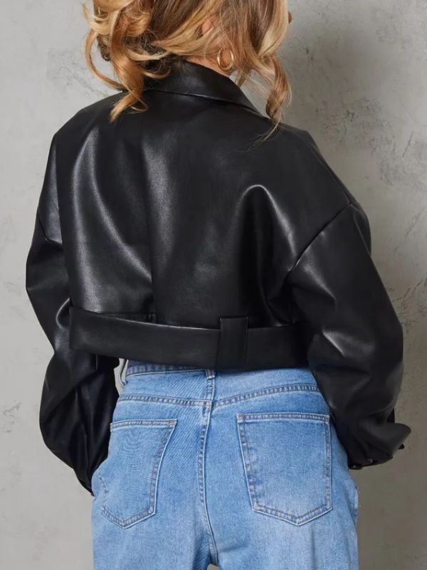 This black cropped leather jacket pairs perfectly with high-waisted jeans, skirts, or dresses. You can style it with boots for a strong statement look. It also works well with sneakers for casual streetwear. Therefore, it transitions easily from daytime outings to evening events.