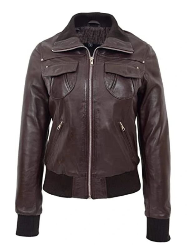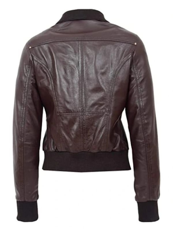 Brown Slim Fit Bomber Leather Jacket For Women’s