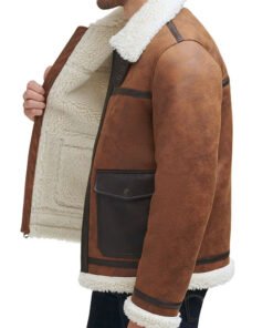 The jacket features a shearling-lined collar that adds both style and protection against cold winds. Moreover, the sturdy front closure allows a secure and adjustable fit. Full-length sleeves with shearling cuffs help retain warmth, while also contributing to the authentic aviator aesthetic. As a result, the jacket offers both practicality and timeless style.