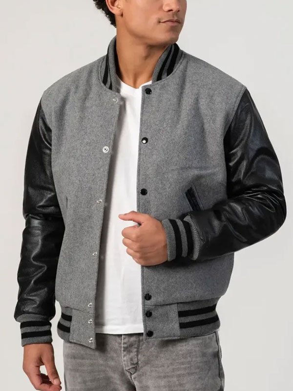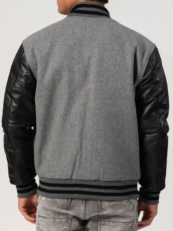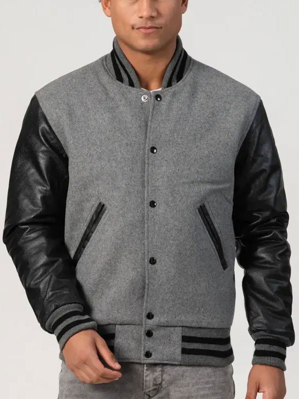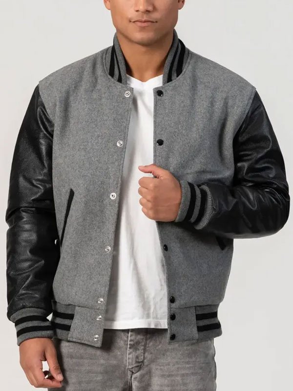 Black Grey Varsity Jacket With Leather Sleeves