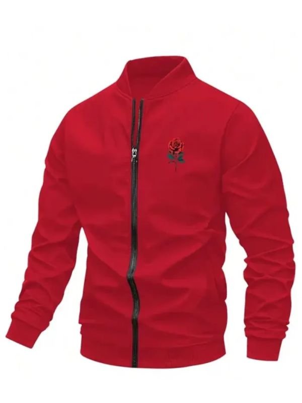 Additionally, the rib-knitted collar, cuffs, and hem enhance the jacket’s structure and fit. The front closure allows easy wear, while functional pockets add everyday practicality. The rose and slogan print stands out beautifully against the base color, creating a romantic yet edgy look that pairs effortlessly with jeans, joggers, or sneakers.