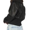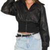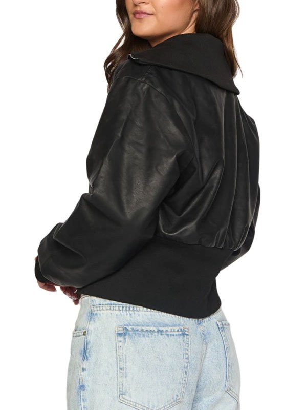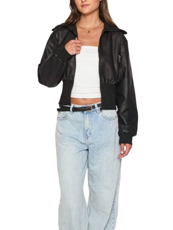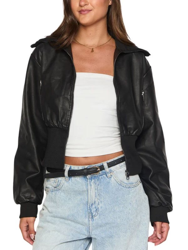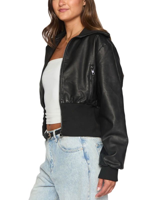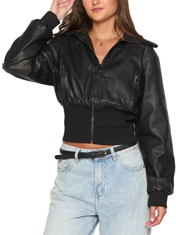 Stylish Women’s Cropped Rib-Knitted Waist Leather Bomber Jacket
